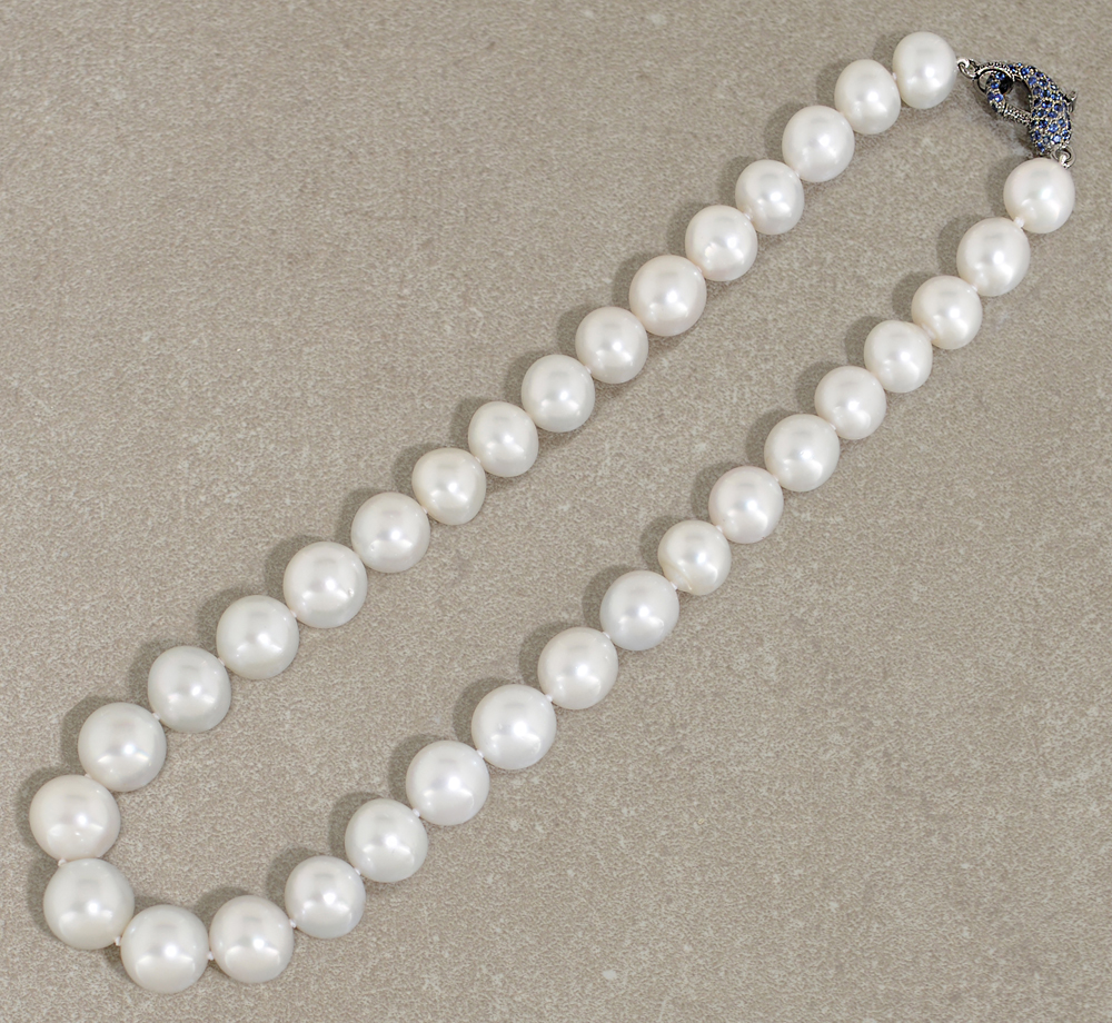 COLLANA. Ad un filo di perle coltivate South Sea disposte a degradè dal centro di mm 15/12 ca. con chiusura a moschettone in oro bianco brunito 18 kt e piccoli zaffiri taglio rotondo per tot. cts. 1,00 ca.