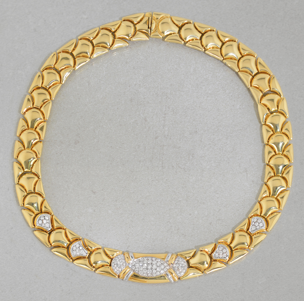 COLLANA DI DAMIANI. In oro giallo e bianco 18 kt a maglie incernierate realizzate in oro scatolato con decoro frontale in diamanti taglio brillante per tot. cts. 2,50 ca.