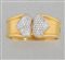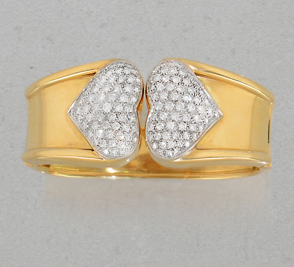 BRACCIALE. In oro giallo 18 kt, semirigido realizzato in lamina stampata, sul fronte motivi a cuore in oro bianco 18 kt con diamanti taglio brillante disposti a pavè per tot. cts. 4,20 ca.; apertura centrale a scatto.