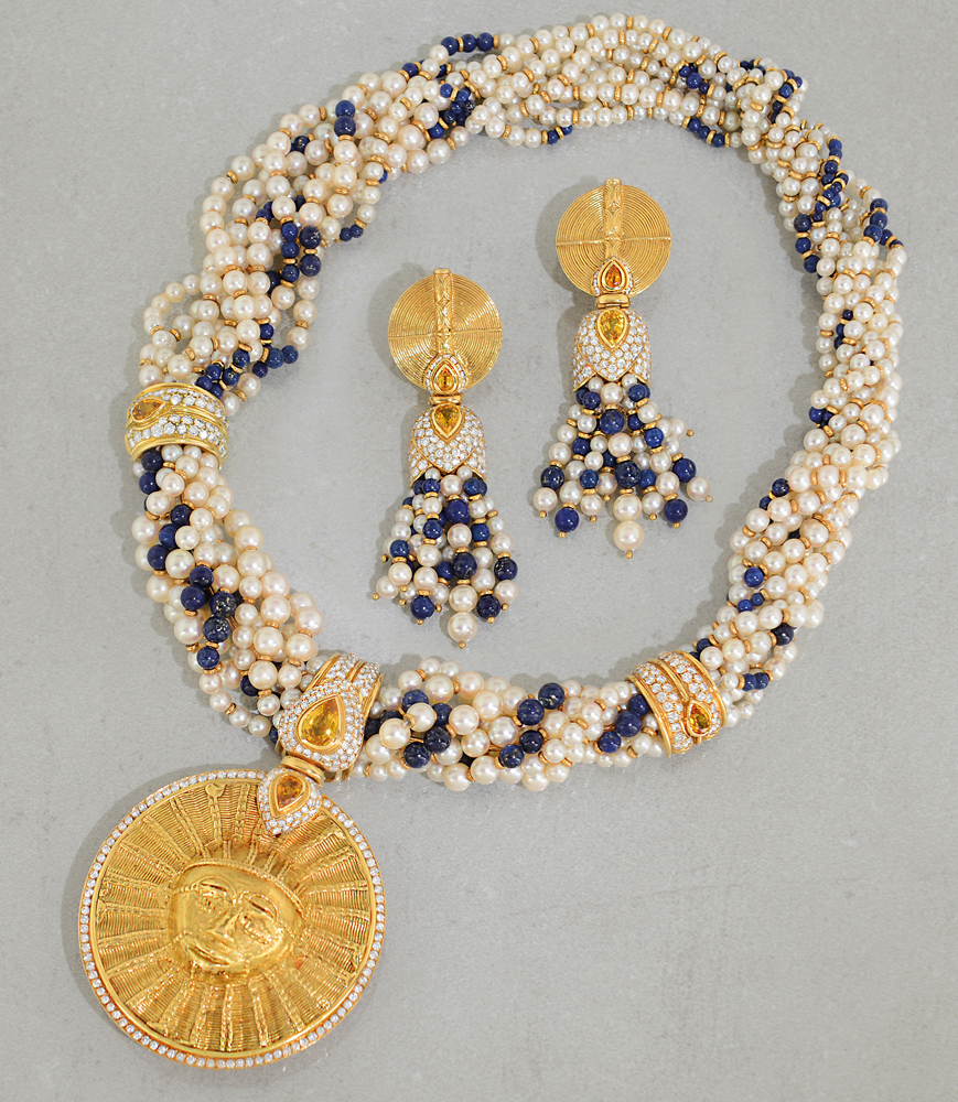 DEMI PARURE. In oro giallo 18 kt composta da coppia di orecchini a clip e da collana con grande medaglione, perle coltivate e boules di lapislazzuli, zaffiri gialli taglio goccia per tot. cts. 10,00 ca., diamanti taglio brillante per tot. cts. 10,00 ca.