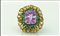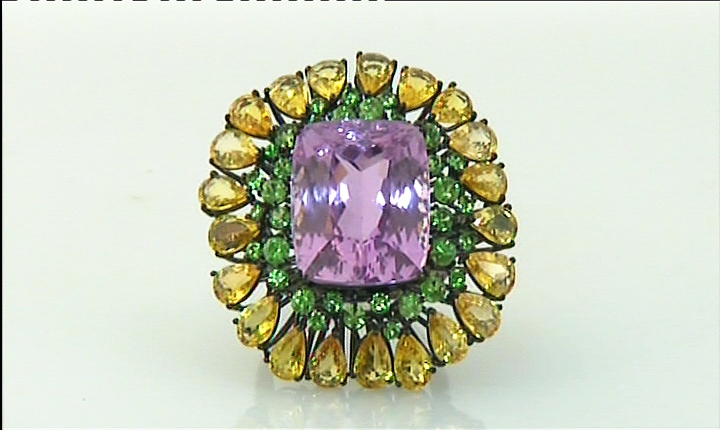 ANELLO. In oro bianco brunito 18 kt centrato da kunzite taglio cuscino di cts. 25,00 ca., zaffiri gialli taglio goccia per tot. cts. 9,00 ca. e peridoti taglio rotondo per tot. cts. 2,50 ca.