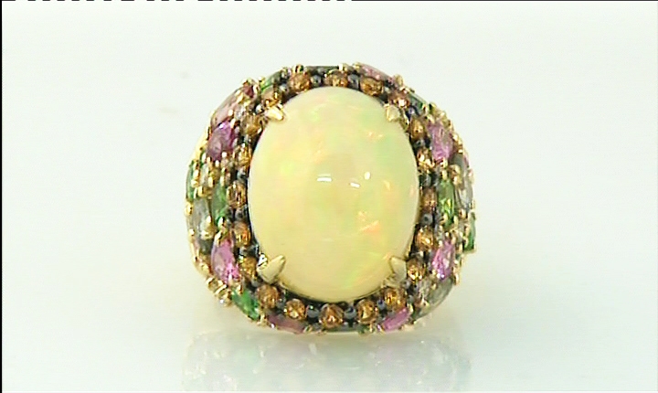 ANELLO. In oro giallo 18 kt internamente rivestito, opale taglio ovale cabochon, gemme preziose multicolor di vari tagli (prob. zaffiri e peridoti) per tot. cts. 6,40 ca. e diamanti taglio brillante per tot. cts. 0,40 ca.
