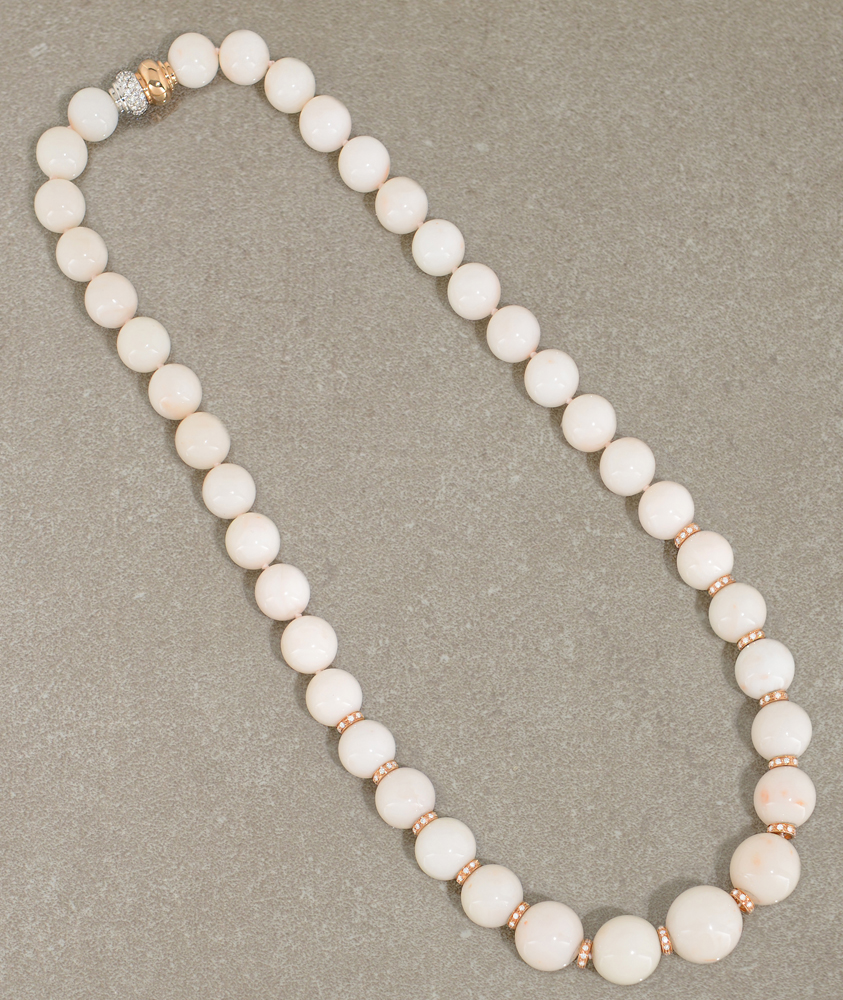 COLLANA. Ad un filo di sfere in corallo peau d'ange disposte a degradè dal centro con interruttori e chiusura in oro rosa e bianco 18 kt decorati da diamanti taglio brillante per tot. cts. 2,00 ca.