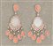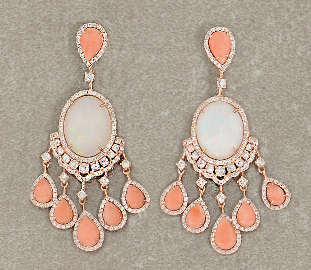 COPPIA DI ORECCHINI PENDENTI. In oro rosa 18 kt perno e farfalla con diamanti taglio rosa e brillante per tot. cts. 3,60 ca., inserti in corallo arancio Giappone taglio goccia ed al centro opali taglio ovale cabochon.
