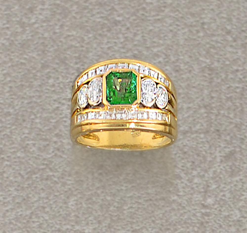 ANELLO. In oro giallo 18 kt con smeraldo taglio rettangolare a contorno ottagonale di cts. 1,00 ca. ai lati quattro diamanti taglio ovale per tot. cts. 0,60 ca. e diamanti taglio carrè incastonati a binario per tot. cts. 1,00 ca.