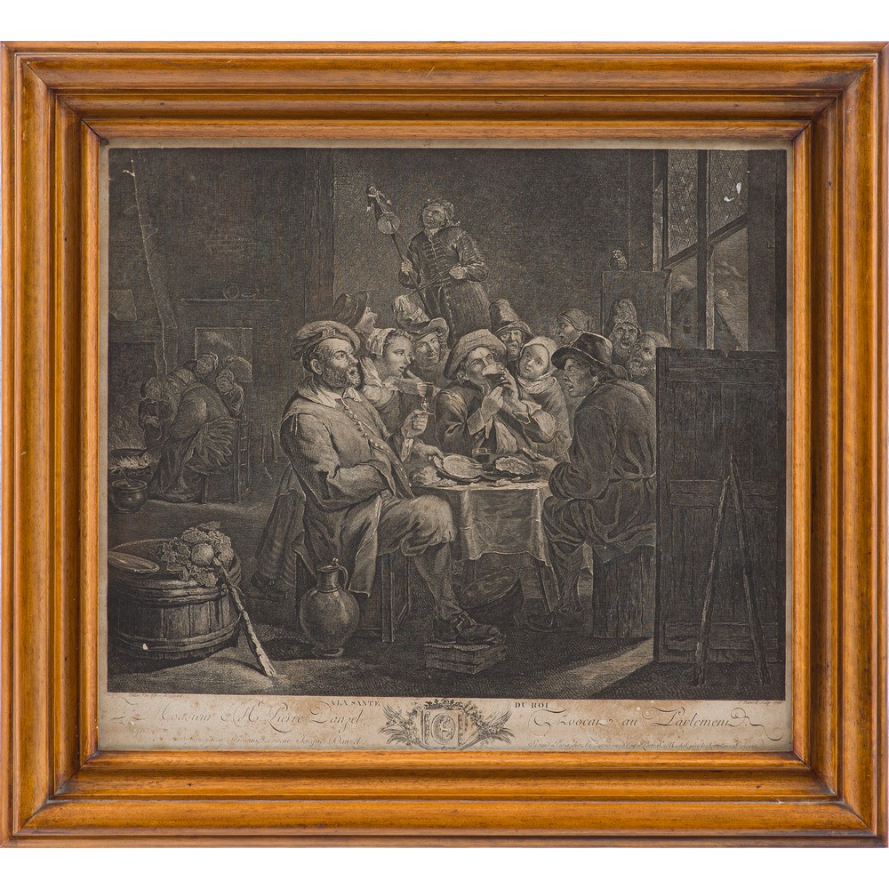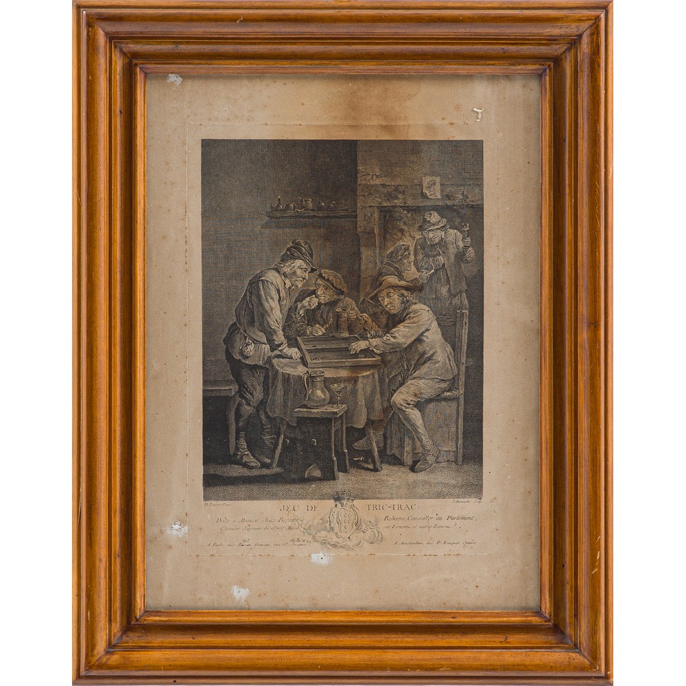 Coppia di incisioni a bulino su carta raffiguranti "Scena di taverna" da David Teniers e Gillis Van Tilborgh entro cornici in legno.