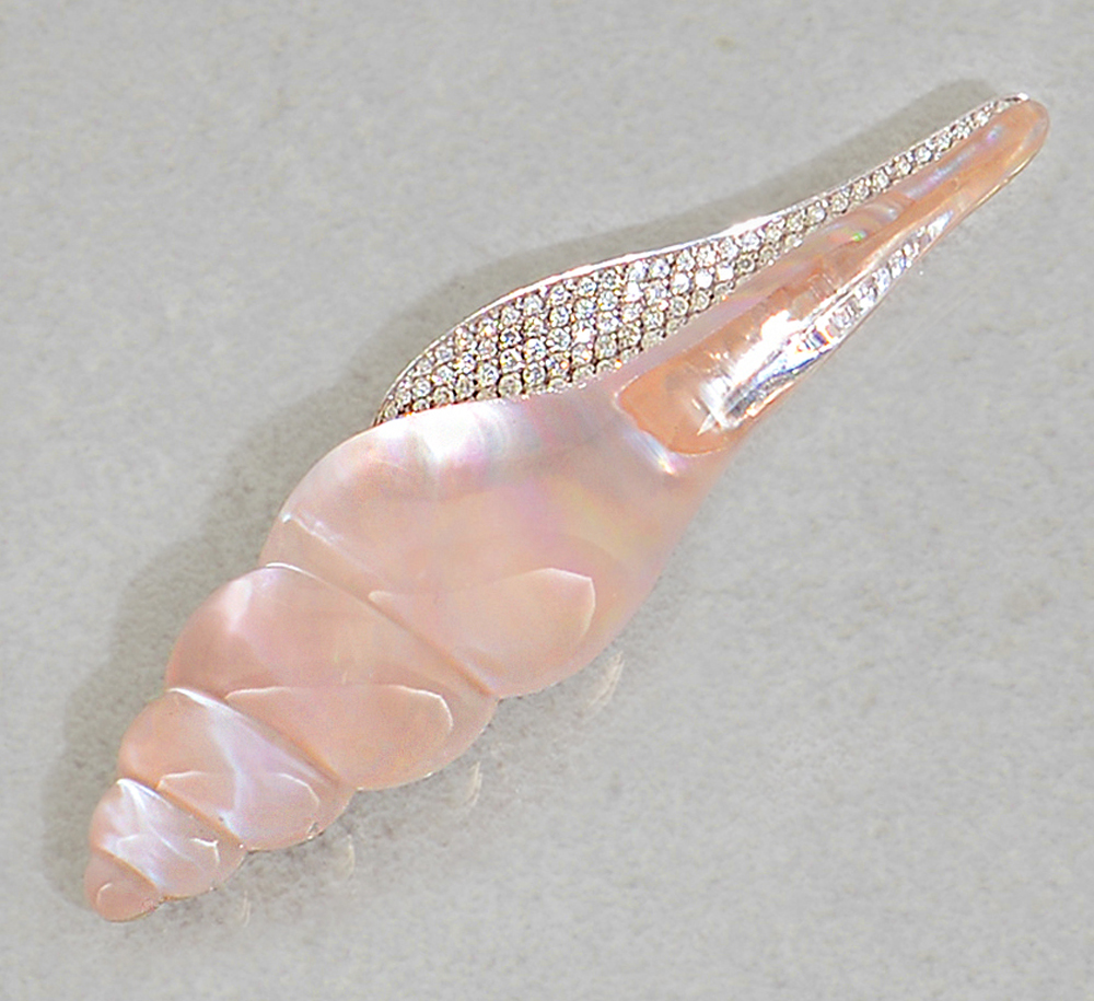 SPILLA DI VHERNIER. In oro giallo e bianco 18 kt a conchiglia in gemma bianca intagliata su fondo in madreperla rosa, diamanti taglio brillante per tot. cts. 1,00 ca. chiusura a doppio ago.