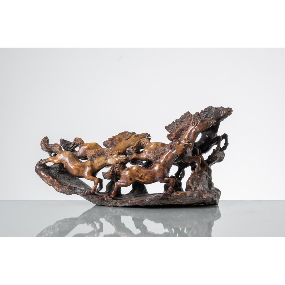 Scultura in pietra saponaria raffigurante "Branco di cavalli".