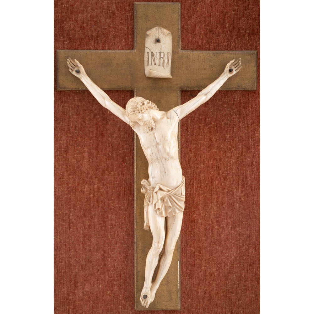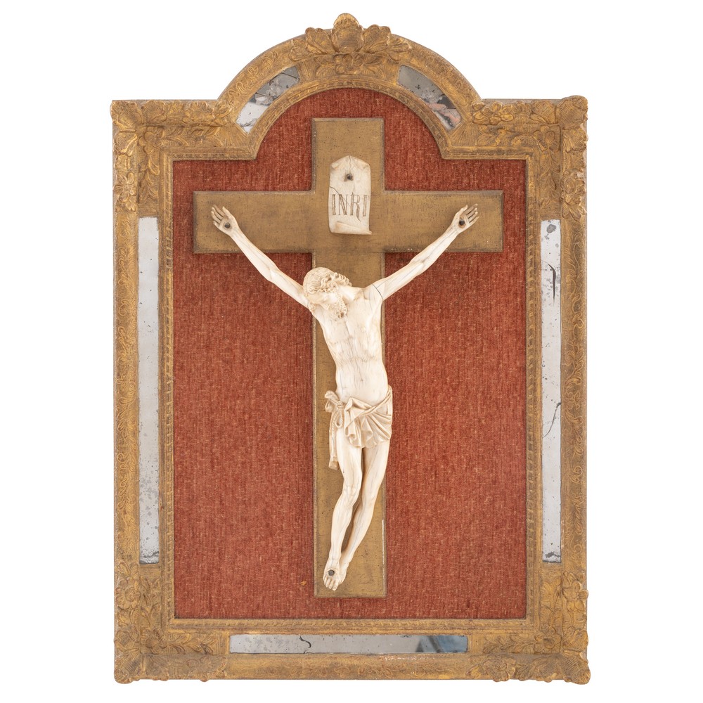 Importante scultura in avorio raffigurante "Cristo" entro cornice in legno dorato ad oro zecchino riccamente intagliato, riquadrature di specchi. L'opera è corredata da certificato Cites.