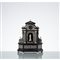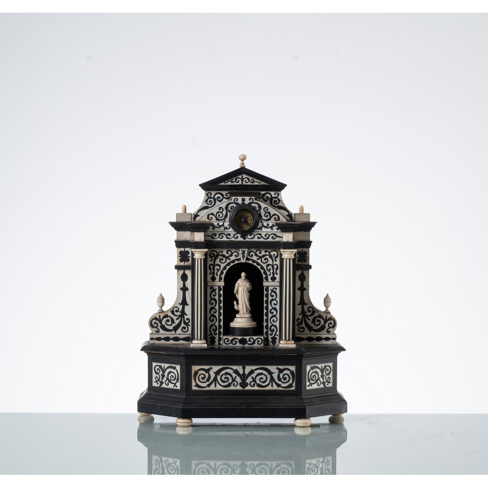 Orologio da appoggio a tempietto in avorio e legno di ebano, colonne con capitelli sul fronte e scultura in avorio raffigurante "Santo" (meccanismo da revisionare). L'opera è corredata da certificato Cites.