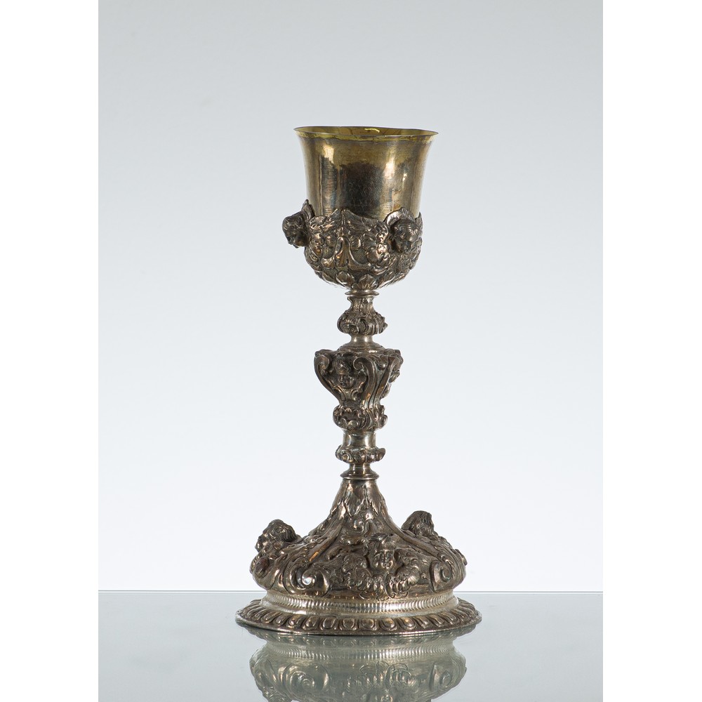 Calice in argento riccamente sbalzato con putti, interno coppa in argento vermeil (usure).