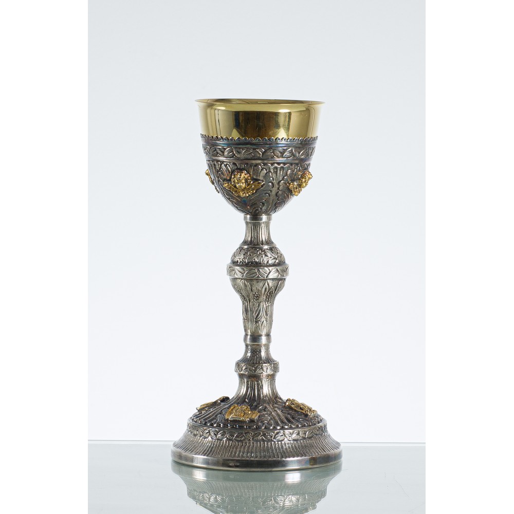 Calice in argento stile Luigi XVI con coppa, testine di angeli e segni religiosi in argento vermail.