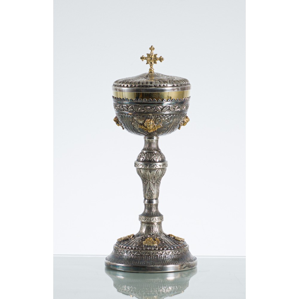 Pisside in argento stile Luigi XVI con coppa, testine di angeli e segni religiosi in argento vermail.