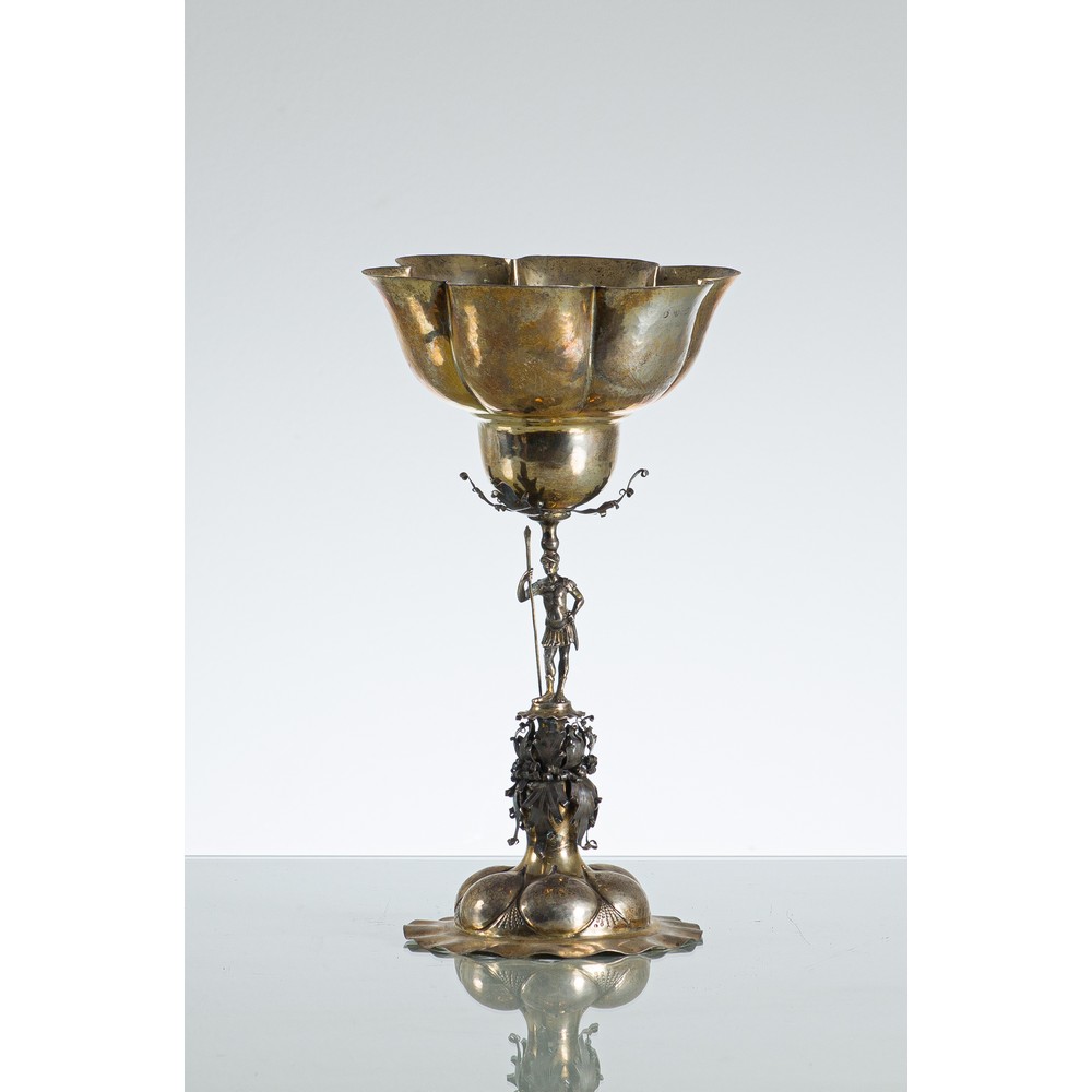 Calice in argento sbalzato, coppa centinata sorretta da soldato con lancia (g. 401).
