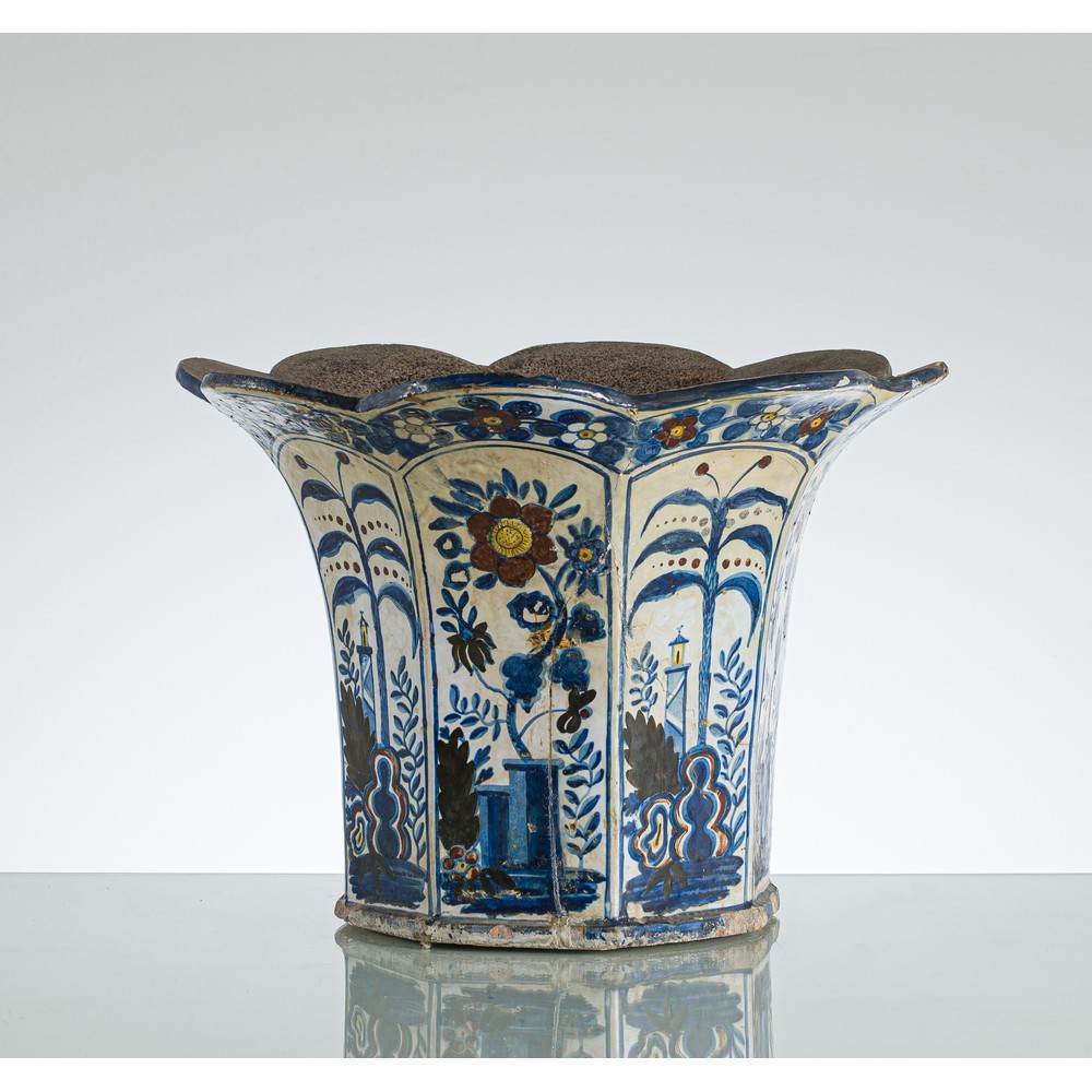 Porta piante in ceramica smaltata e decorata (usure, rotture e restauri).