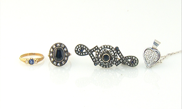 LOTTO DI QUATTRO GIOIELLI. In oro giallo, bianco 18 kt ed argento composto da due anelli, una spilla ed un ciondolo con catenina, decori in diamanti taglio brillante per tot. cts. 0,40 ca., zaffiri taglio rotondo ed ovale per tot. cts. 4,50 ca. e diamanti taglio rosa.