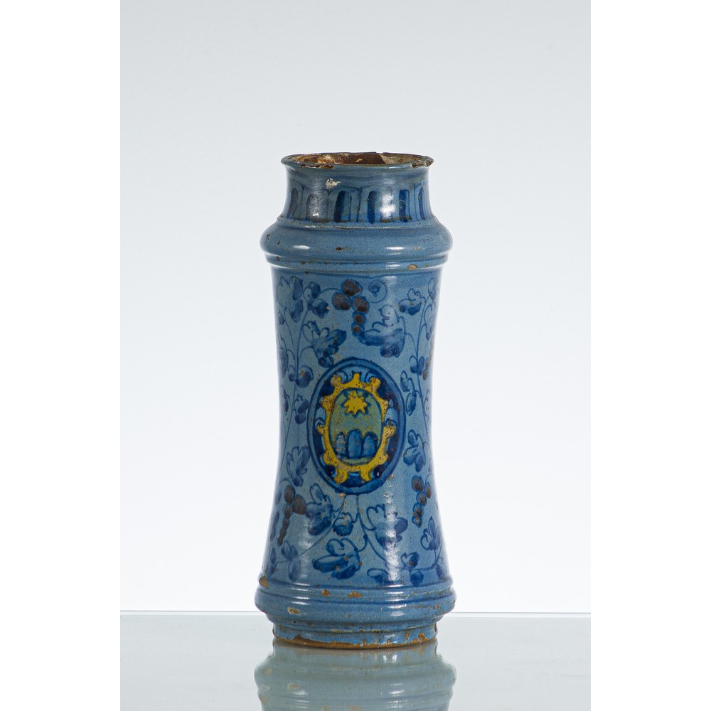 Albarello in ceramica smaltata e decorata a motivo fogliaceo con medaglione raffigurante "Stemma nobiliare" (usure e restauri al collo).