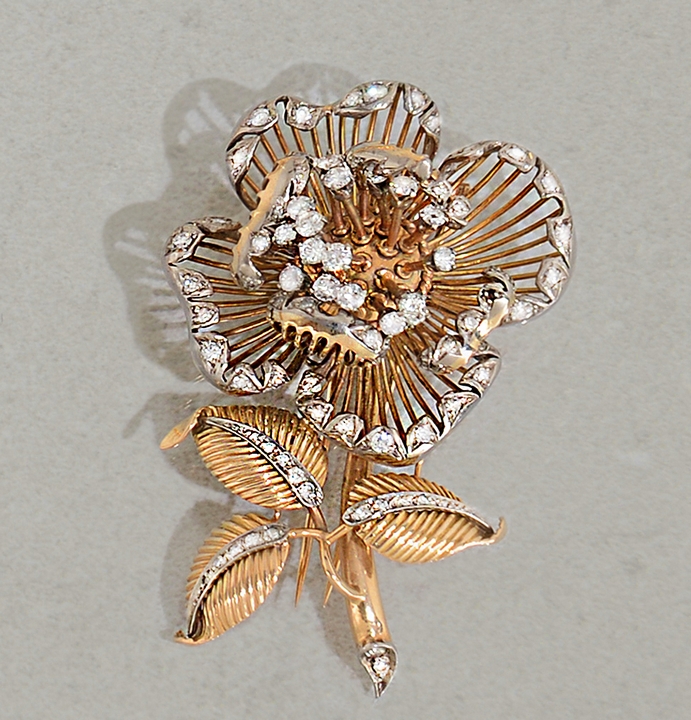 SPILLA ANNI '50. In oro giallo e bianco 18 kt a grande fiore realizzato a raggera con petali centrali movibili, pistilli "en tremblant", foglie incise e diamanti taglio brillante e huit-huit per tot. cts. 2,00 ca. chiusura a doppio ago.