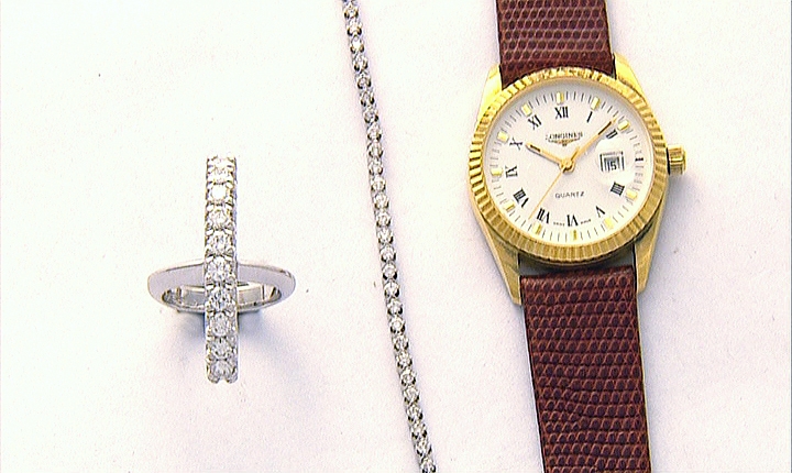 LOTTO DI TRE GIOIELLI. In oro bianco 18 kt composto da anello a rivière verticale in diamanti taglio brillante per tot. cts. 1,00 ca., da bracciale tennis in diamanti taglio brillante per tot. cts. 2,00 ca. e da un Longines cassa in oro giallo 18 kt, quadrante bianco con numeri romani smaltati, movimento al quarzo.