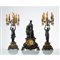 Trittico composto da coppia di candelabri raffiguranti "Ancelle con torcieri" e orologio in bronzo dorato e patinato, piedi ferini. Firmati Salmson sul piede delle ancelle.