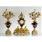 Trittico composto da orologio e due candelabri a sei fiamme in bronzo dorato con ceramiche nei toni del blu cobalto.