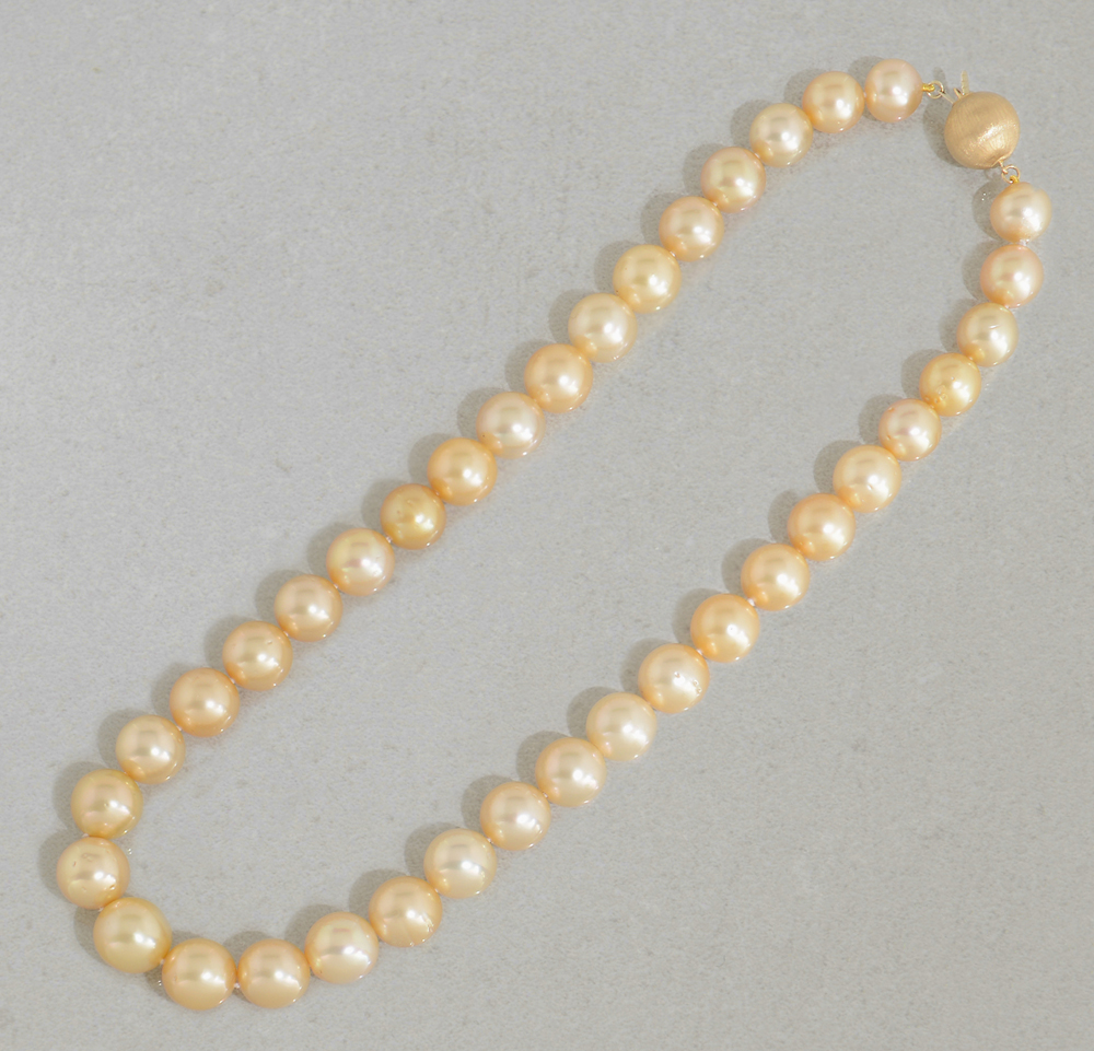 COLLANA. Ad un filo di perle coltivate Tahiti golden disposte a degradè dal centro di mm 12/10 ca. con chiusura sferica oro giallo satinato 14 kt.