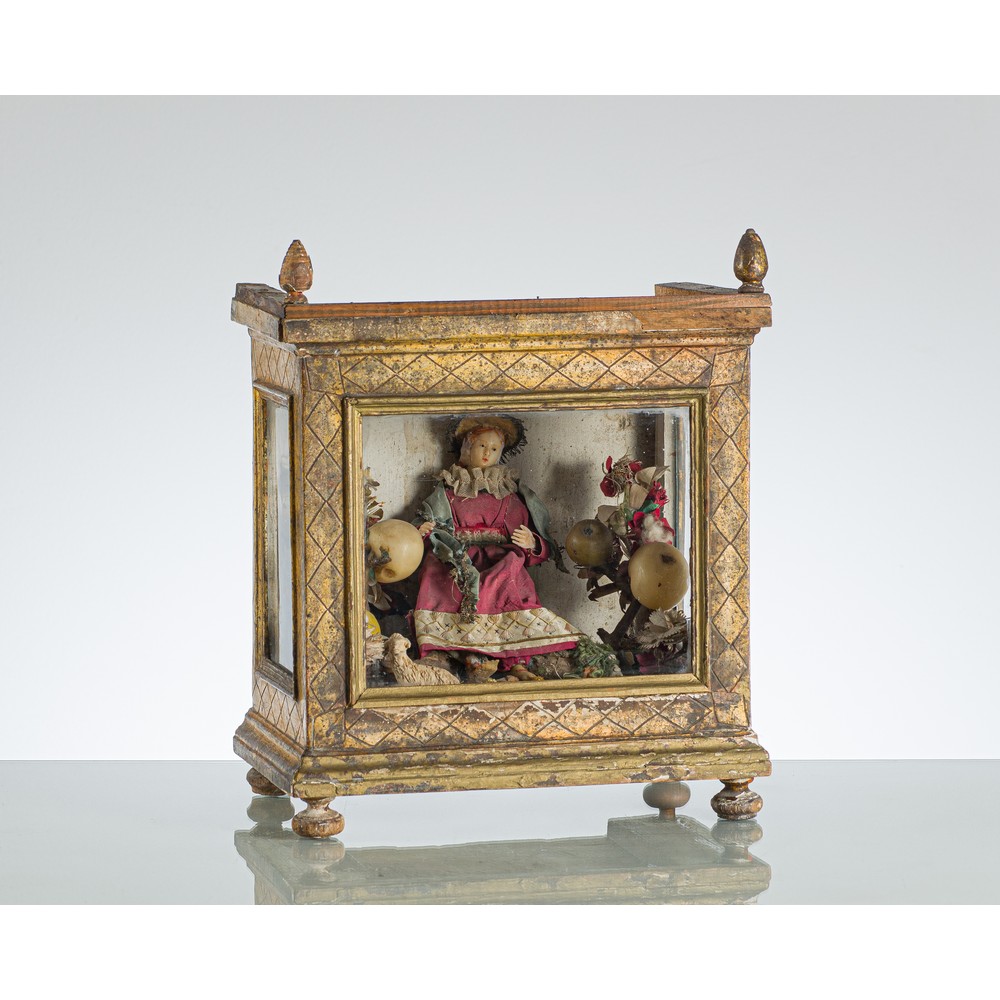 Composizione in ceroplastica raffigurante "Bambin Gesù con fiori e frutta" entro teca coeva in legno dorato ad argento a mecca.
