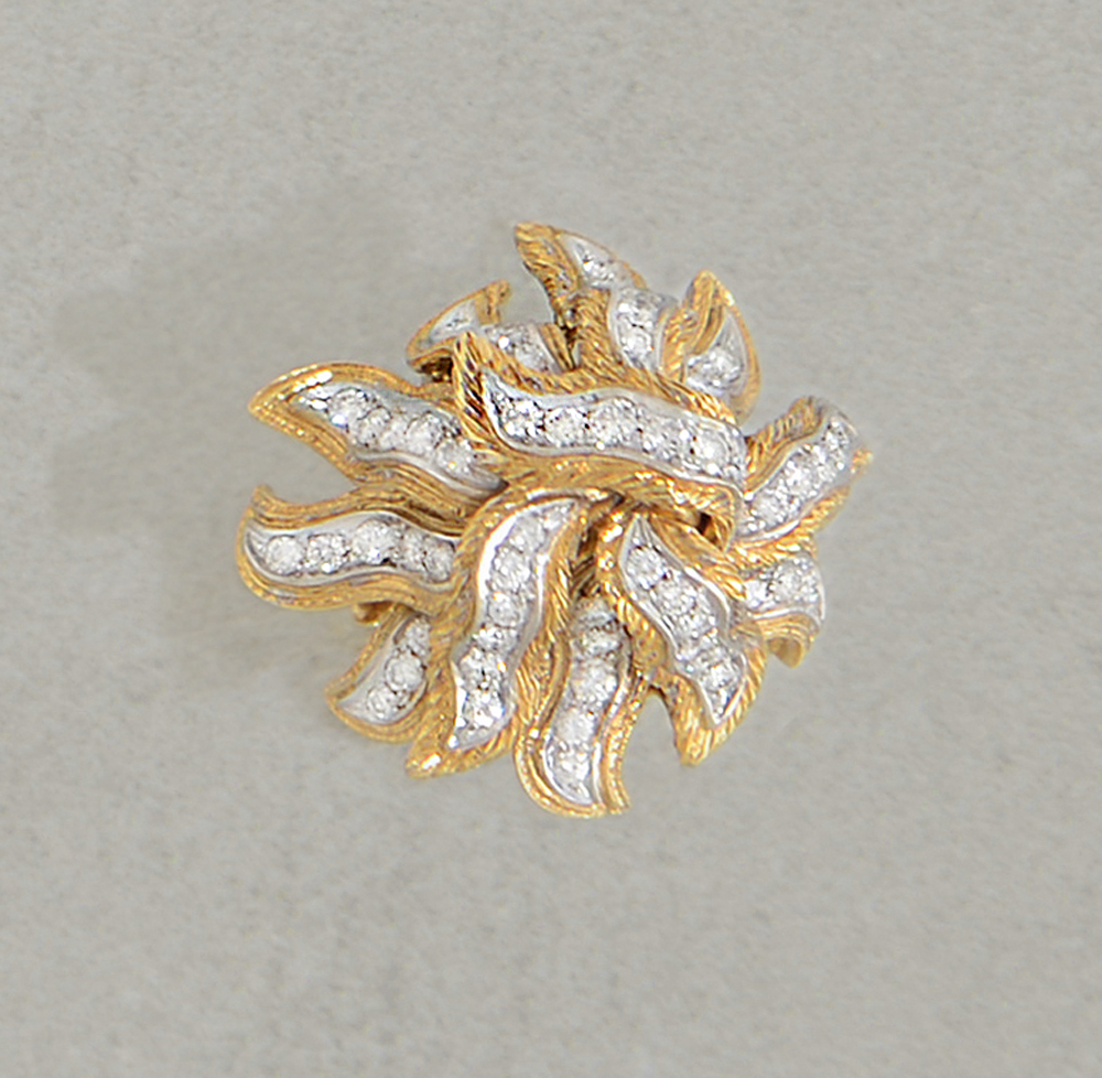 ANELLO. In oro giallo e bianco 18 kt sommità a grandi petali sovrapposti ed incisi con decoro in diamanti taglio brillante per tot. cts. 2,50 ca.