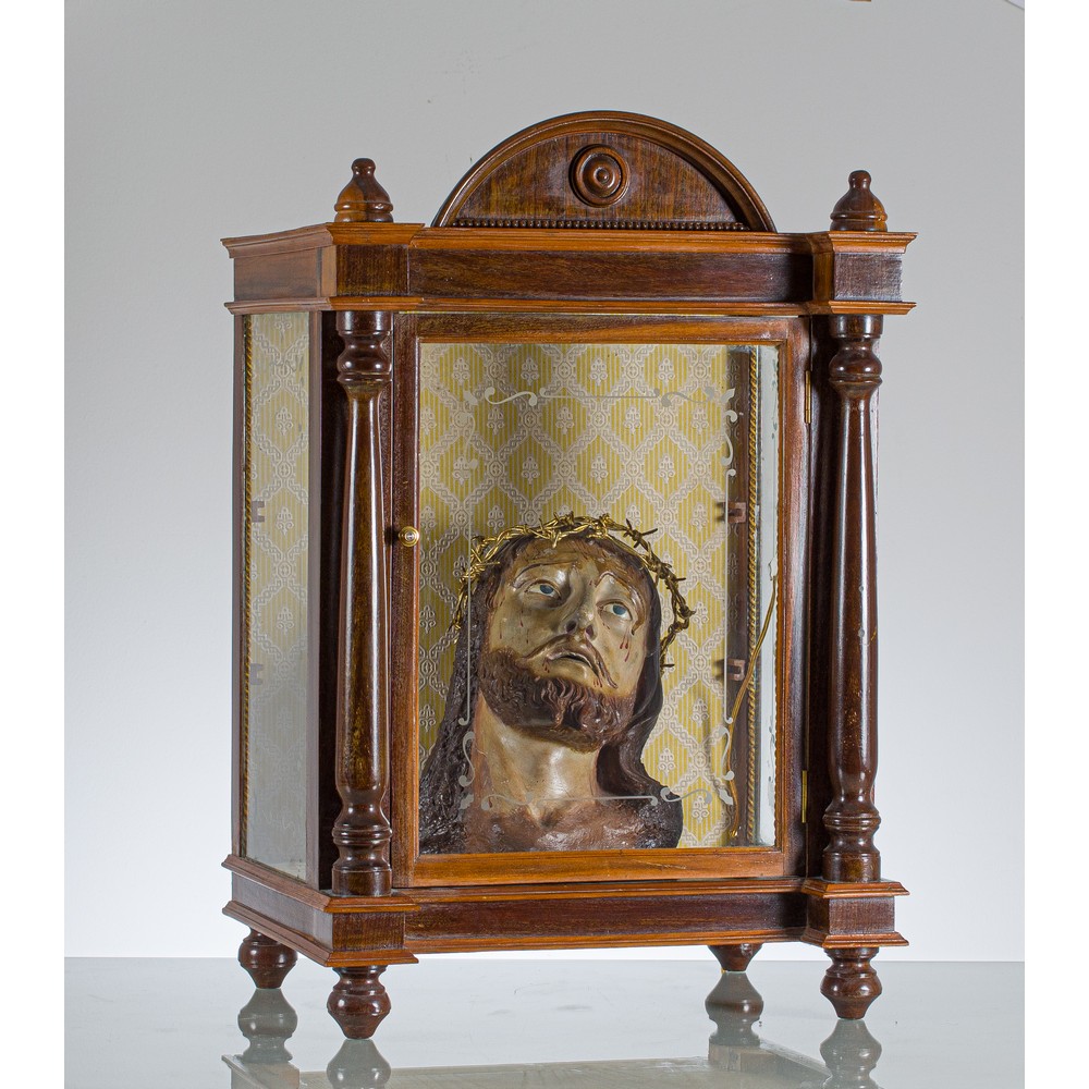 Scultura raffigurante "Ecce Homo" in legno policromo ed occhi in vetro entro teca non coeva in legno