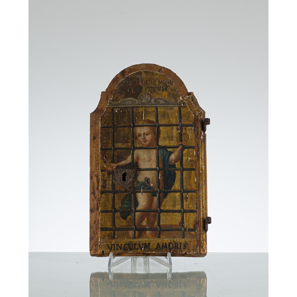Sportello di tabernacolo in legno decorato a fondo oro con pittura raffigurante "Il vincolo dell'amore".