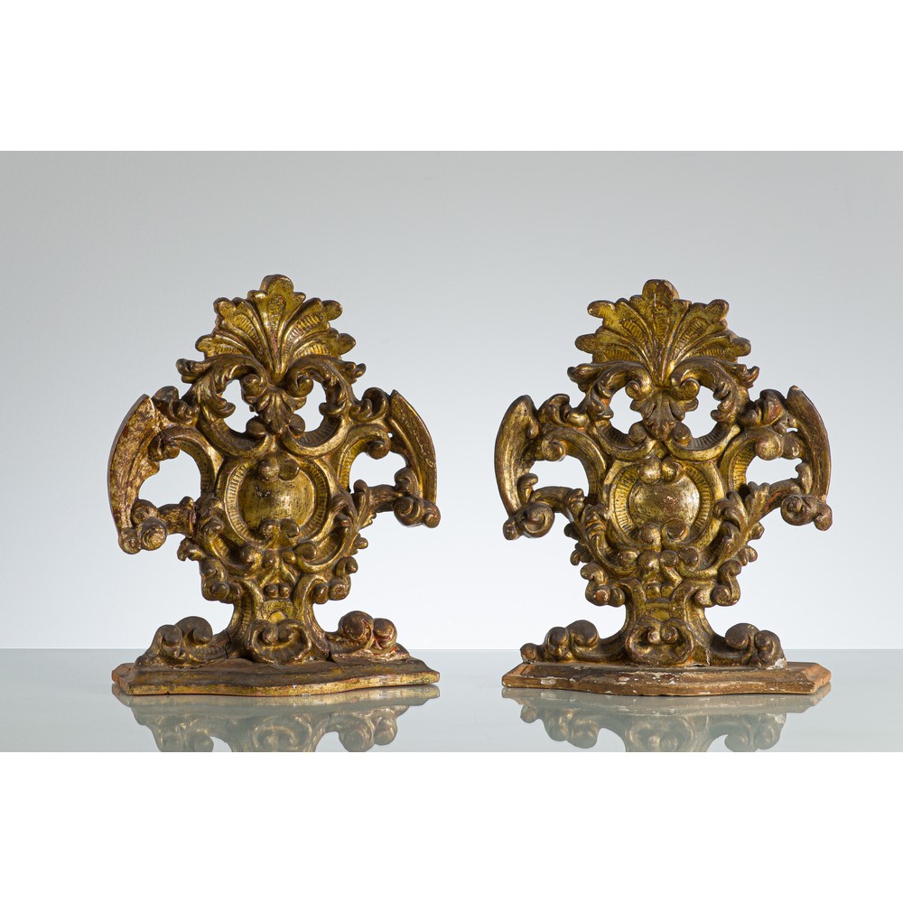 Coppia di fregi d'altare in legno intagliato e dorato ad oro zecchino.