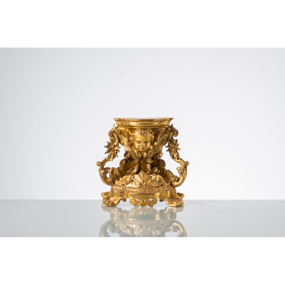Base in legno intagliato e dorato ad oro zecchino con testa di putto.