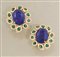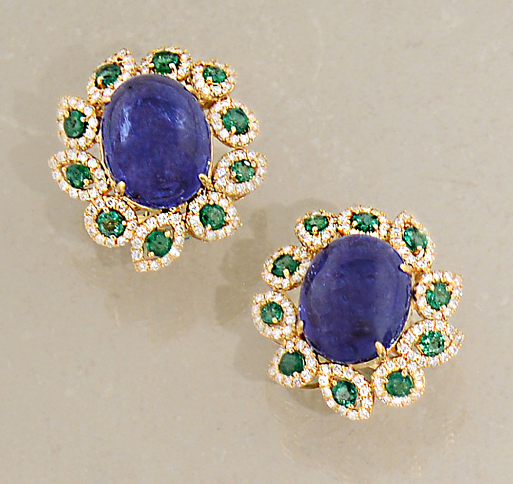 COPPIA DI ORECCHINI. In oro giallo 18 kt perno e clip con al centro due tanzaniti taglio ovale cabochon per tot. cts. 45,50 ca. entro cornice in smeraldi taglio rotondo per tot. cts. 3,30 ca. e diamanti taglio brillante per tot. cts. 2,30 ca.