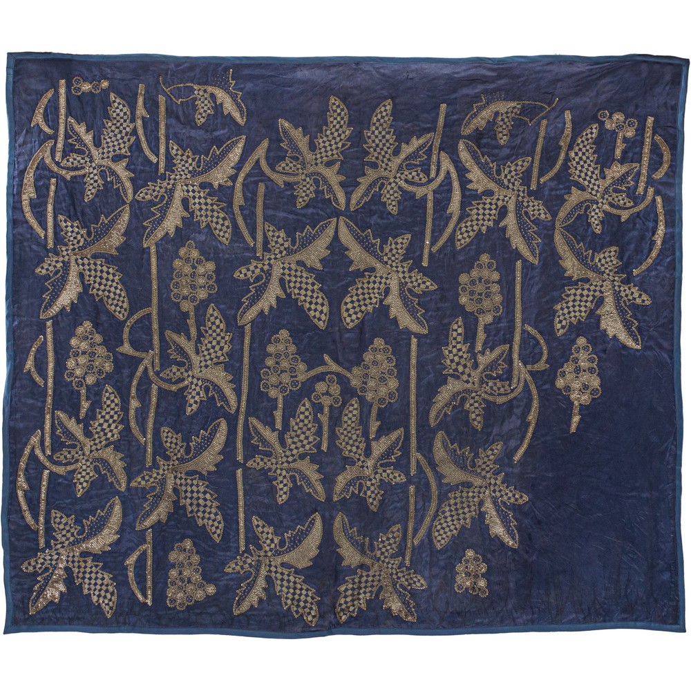 Tessuto da ornamento nei toni del blu riccamente lavorato a fili d'argento e paillettes a motivo fogliaceo e grappoli d'uva.