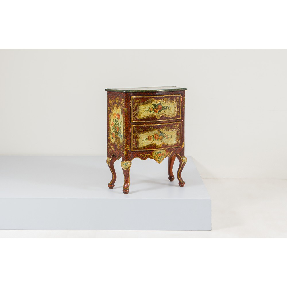 Piccolo cassettone Luigi XIV con due cassetti in legno dipinto e decorato a motivo floreale e fogliaceo, piano in legno laccato a finto marmo (restauri).
