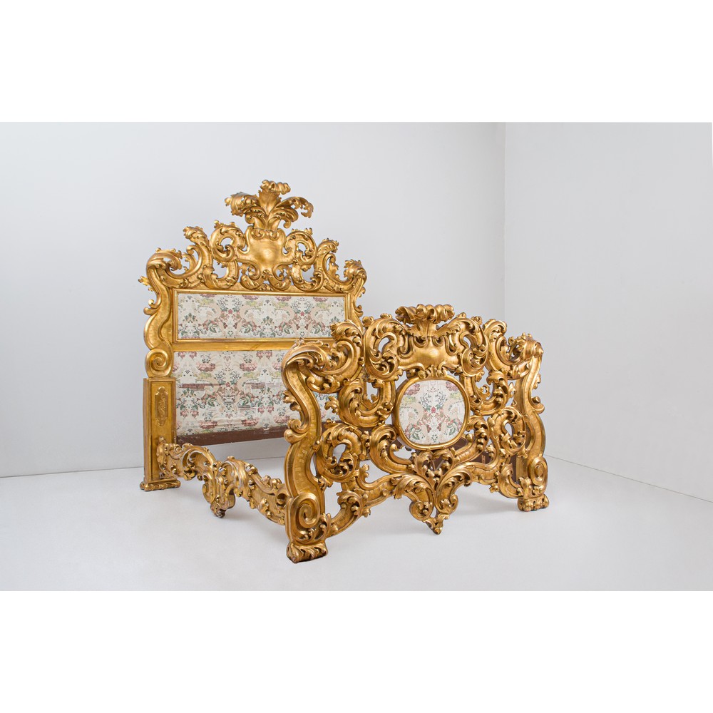 Importante letto in legno dorato ad oro zecchino, riccamente scolpito. Firma e data nella pediera 1910/1911.