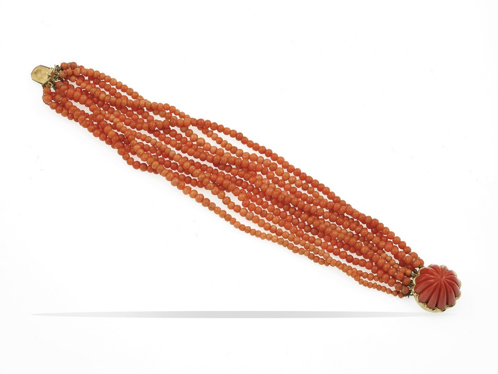 Bracciale a più fili di corallo fermezza in oro giallo 750/1000 con corallo...