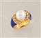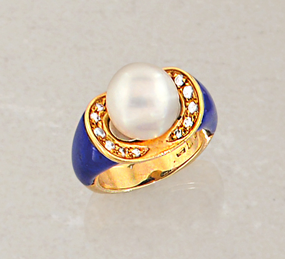 ANELLO DI CALDERONI. In oro giallo 18 kt al centro perla South Sea di mm 12 ca. decori laterali in diamanti taglio brillante per tot. cts. 0,30 ca. con settori laterali in lapislazzuli sagomati.