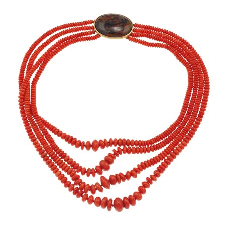Lot 25 | Collana a quattro fili di coralli fermezza in oro giallo 750/1000 con...