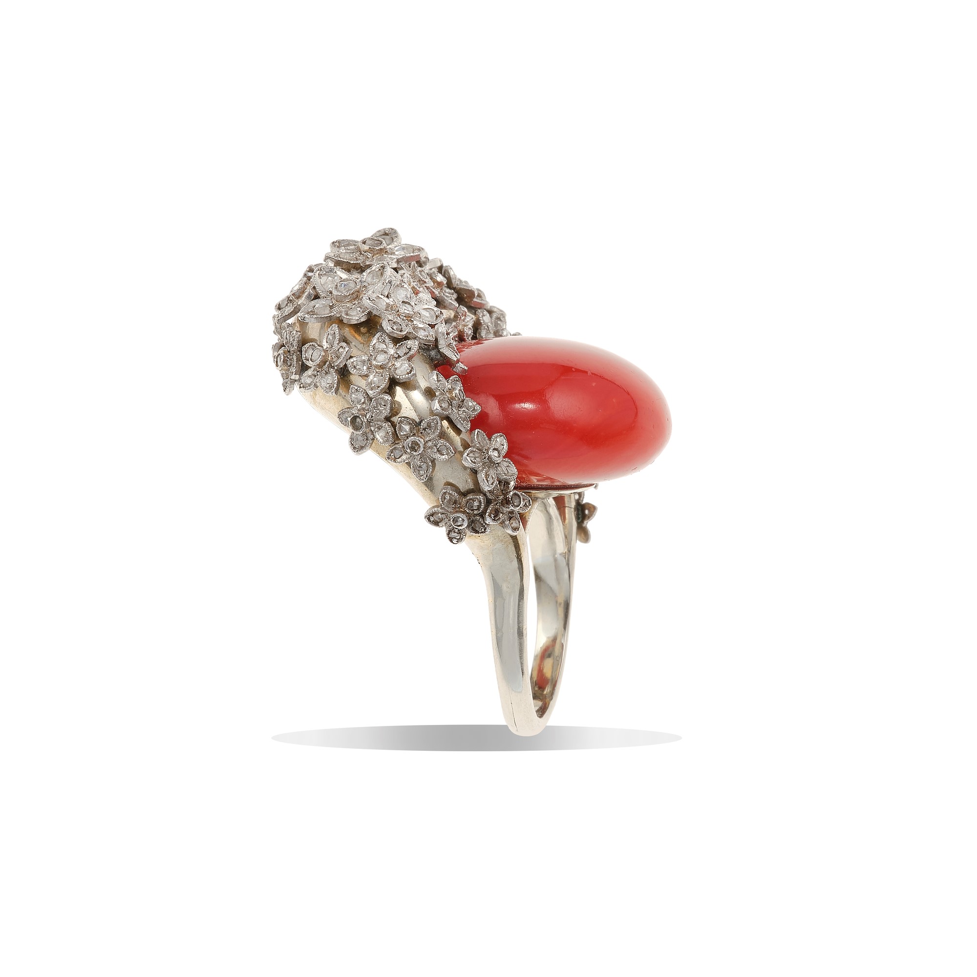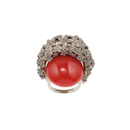 Lot 74 | Anello con corallo e diamanti montatura in oro 750/1000 e platino, gr. 28,2...