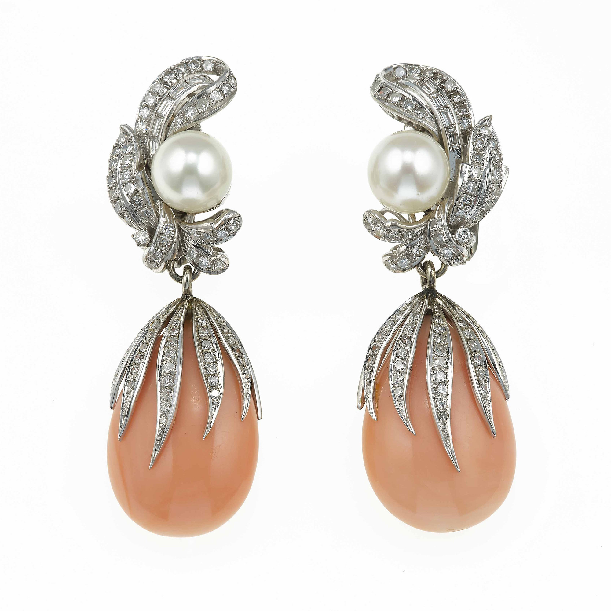 Lot 82 | Orecchini con corallo, diamanti e perle montatura in oro bianco 750/1000, gr....
