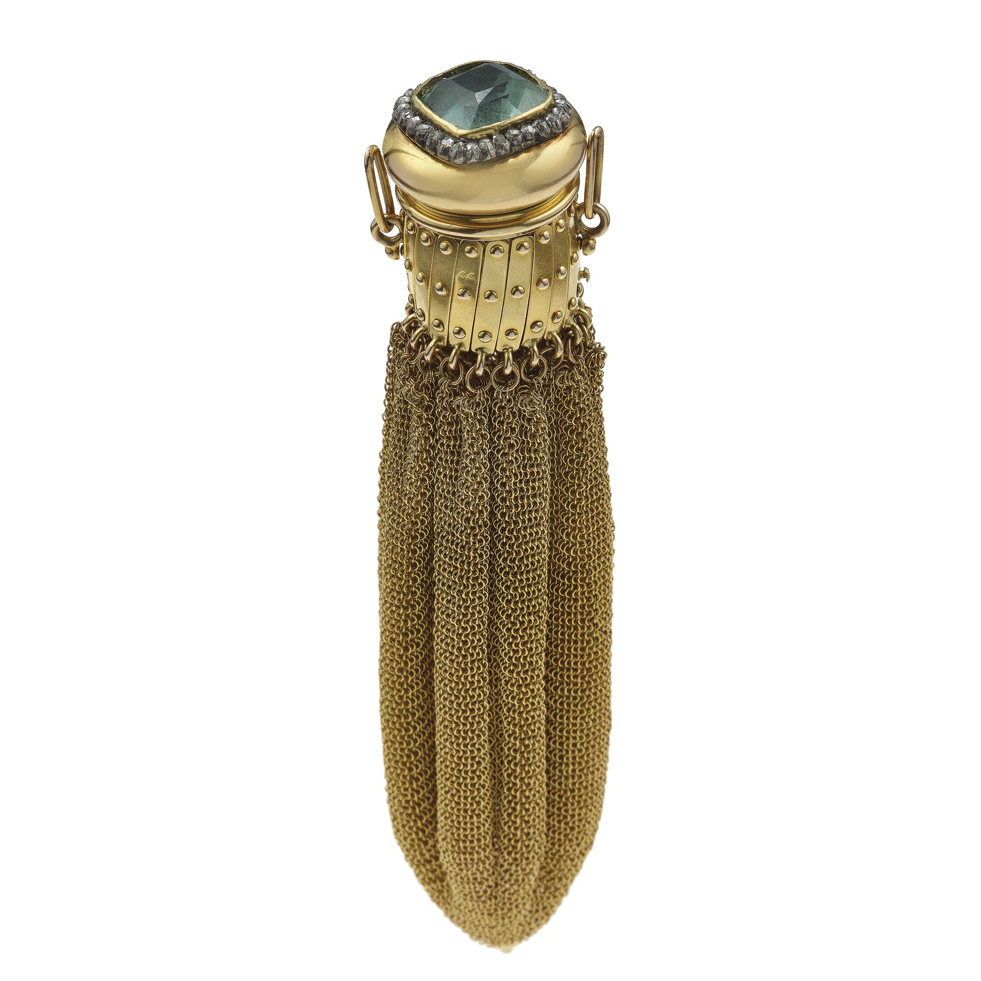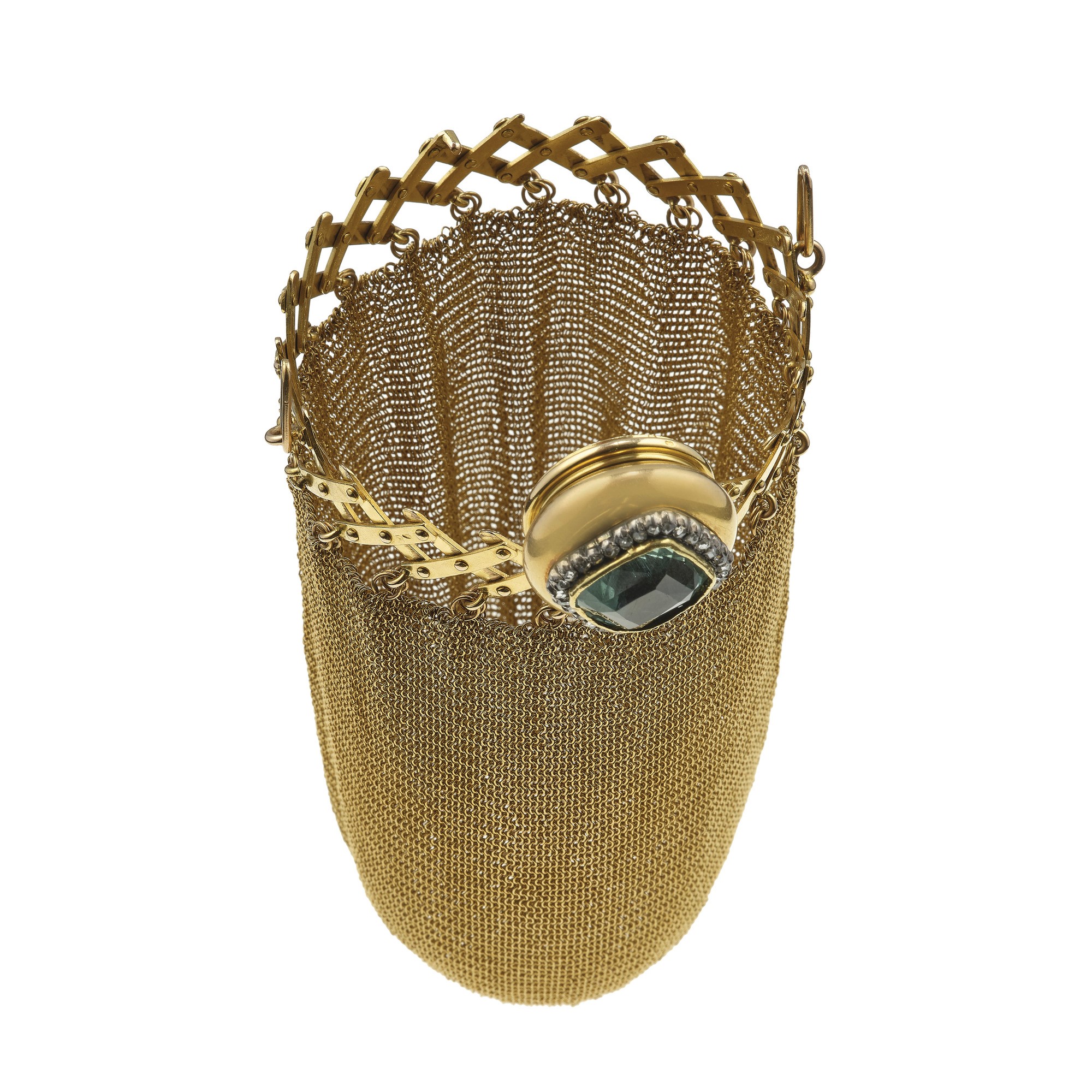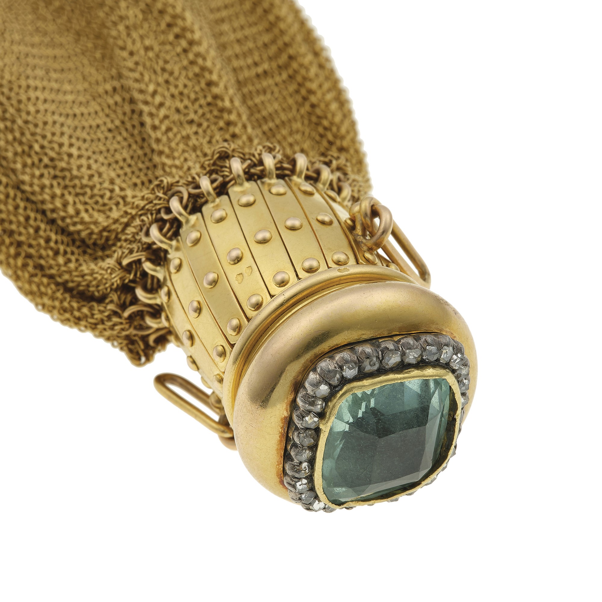 Lot 134 | Borsetta in maglia con berillo verde e rosette di diamante oro giallo...