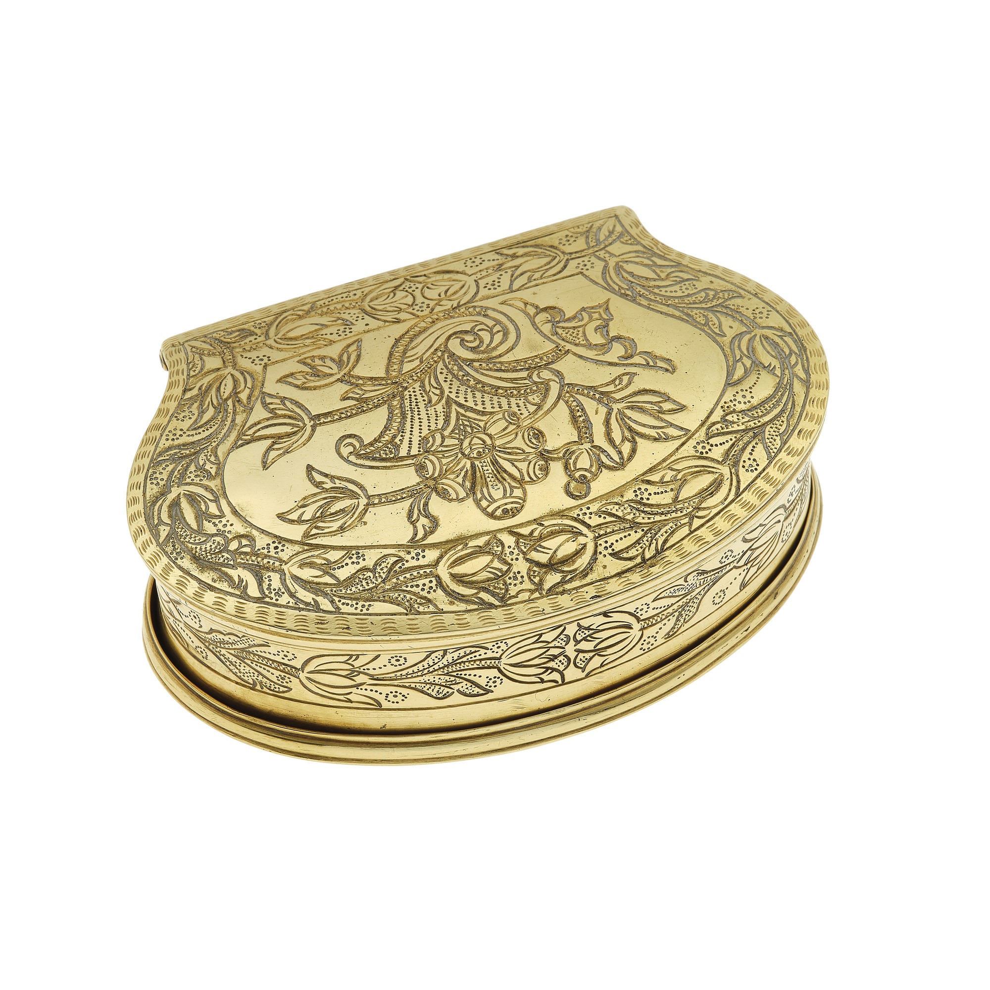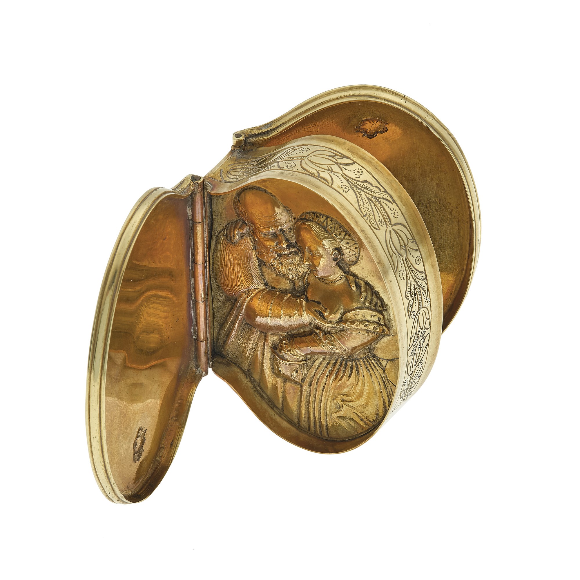 Scatola incisa “cornucopia” oro giallo 750/1000. Punzone non identificato,...