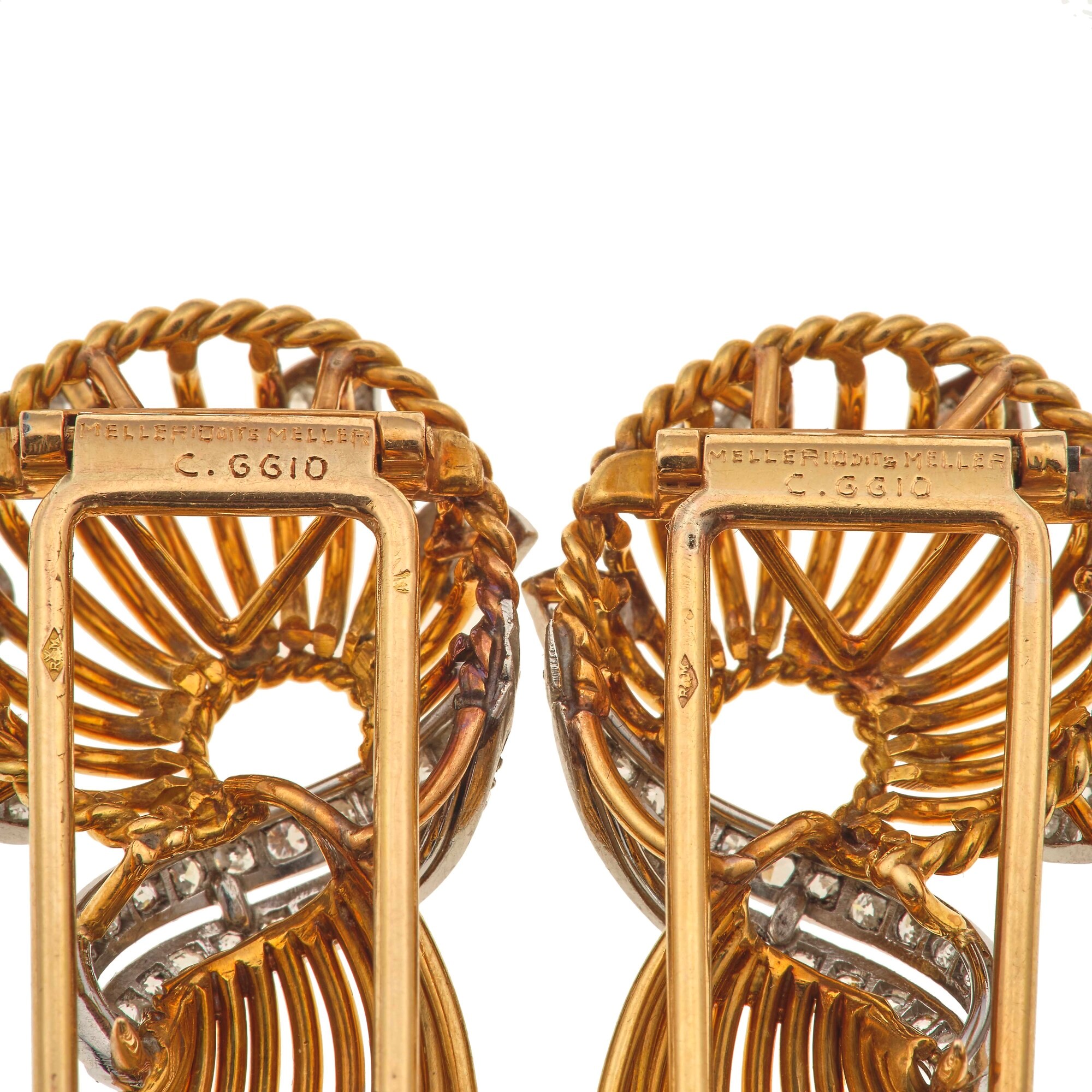 Mellerio dits Meller. Coppia di clips con diamanti e smeraldi taglio cabochon