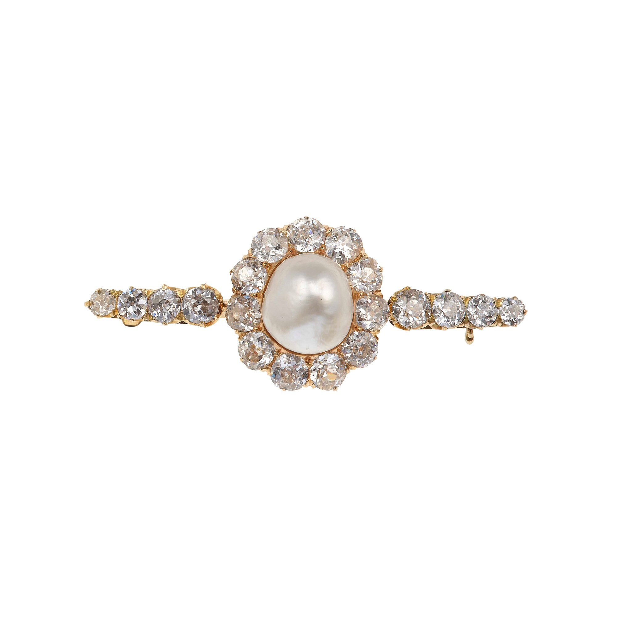 Spilla con perla naturale, acqua salata, di ct 5.37 e diamanti di vecchio taglio