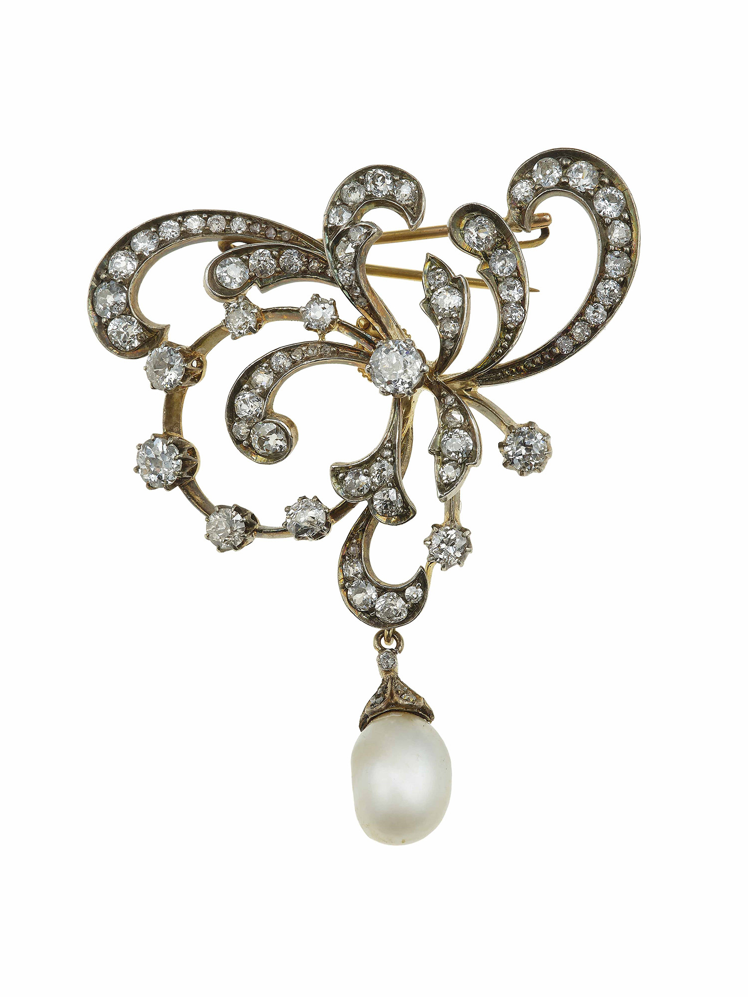 Spilla con perla naturale, acqua salata, di ct 6.41 e diamanti