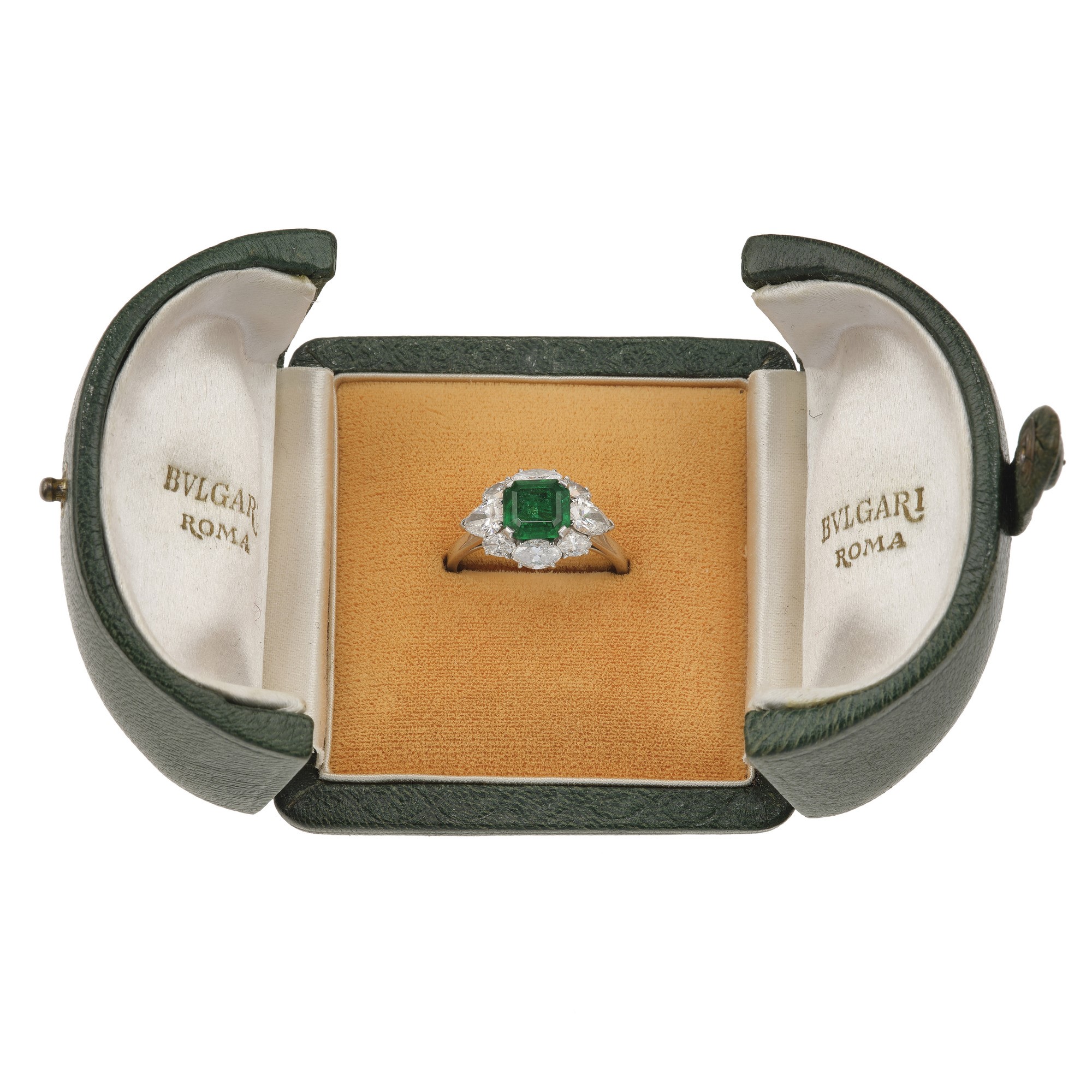 Bulgari. Anello con smeraldo Zimbabwe di ct 1.30 circa e diamanti a contorno per ct 1.94 circa