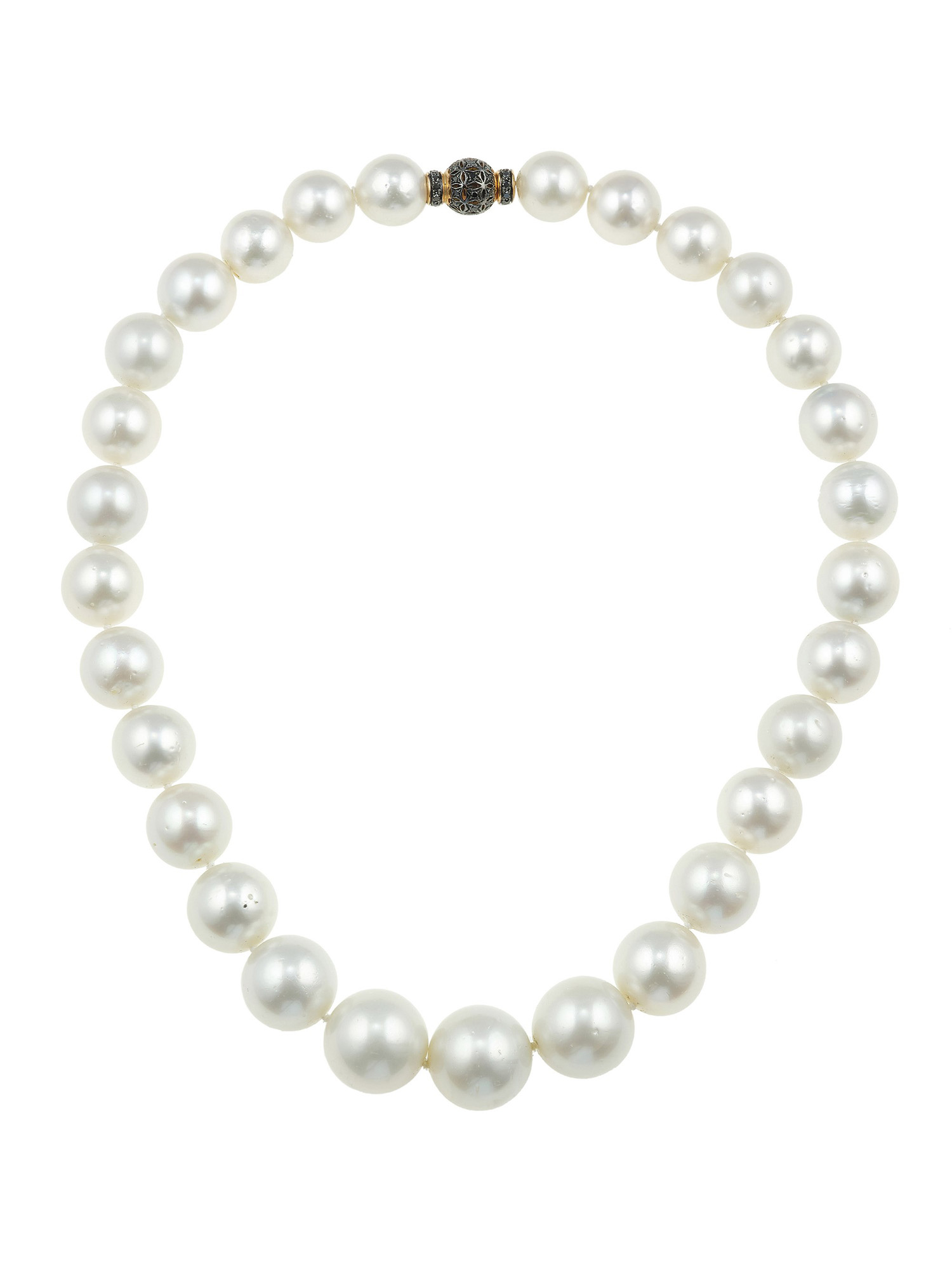 fermezza in oro giallo e piccoli diamanti neri 750/1000. Relazione R.A.G. Torino del 24/07/2024 e radiografia gemmologica, gr. 145,2 cm 47,0 pearl diameter from mm 13,13 to mm 18,15 https://drive.google.com/drive/folders/1YMNjNSJzgw8T58AzgY-wPY_8-7-4Ns6E