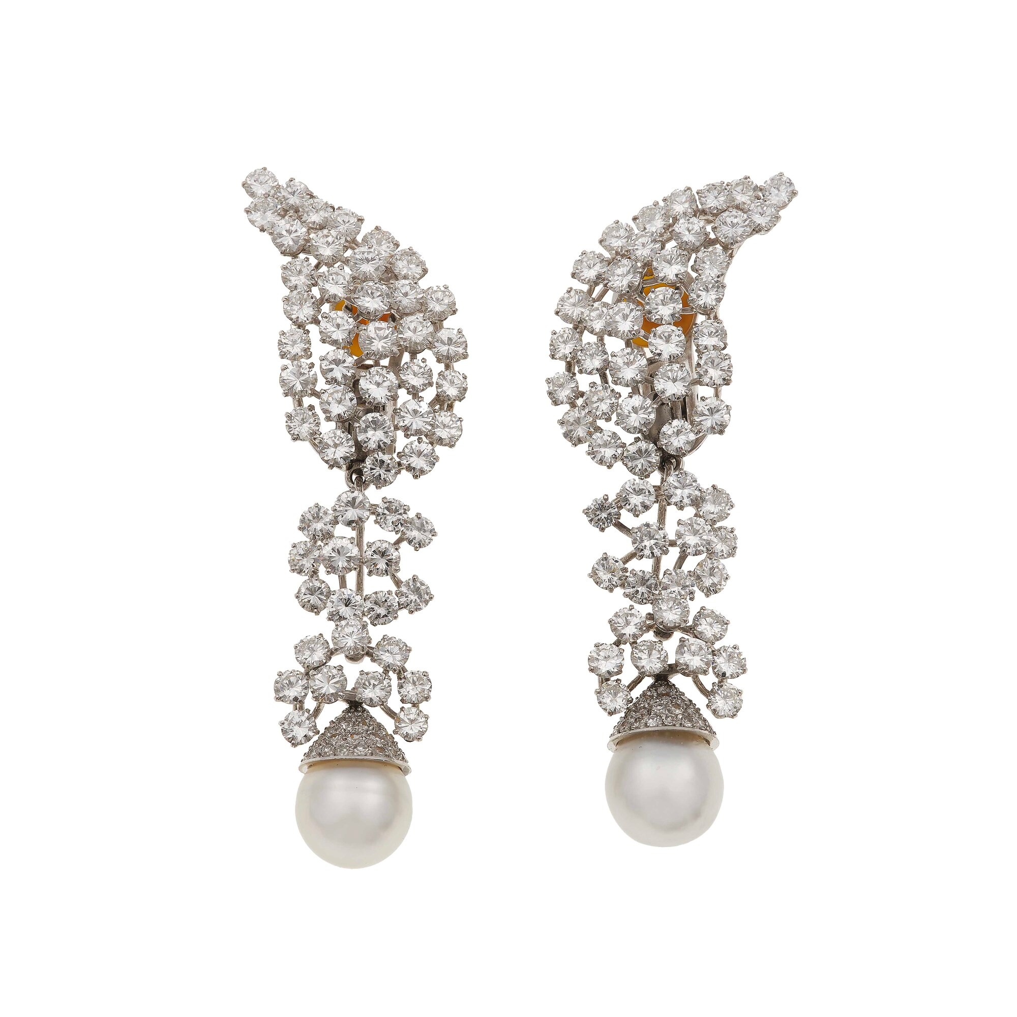 Orecchini pendenti con diamanti taglio brillante per totale ct 16.00 circa e perle coltivate