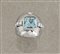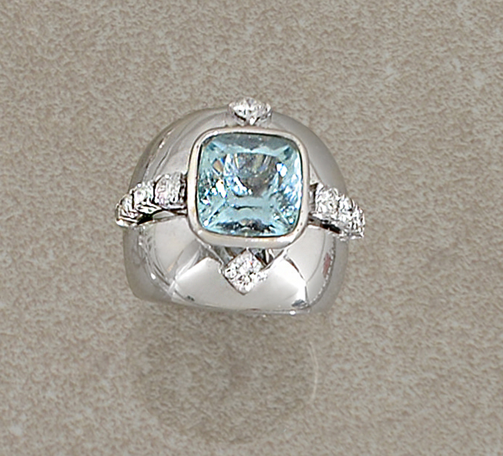 ANELLO. In oro bianco 18 kt internamente foderato realizzato a grande fascia bombata con al centro acquamarina taglio cuscino di cts. 4,00 ca. con ai lati decori in diamanti taglio brillante per tot. cts. 0,90 ca.
